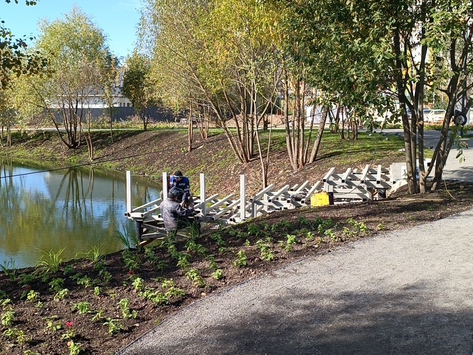 Работы в парке не закончились полностью. Около пруда возвели беседку, установили ограждение и трибуну над водой. В скором времени в парке оборудуют площадку для выгула собак, уже подготовлено основание.