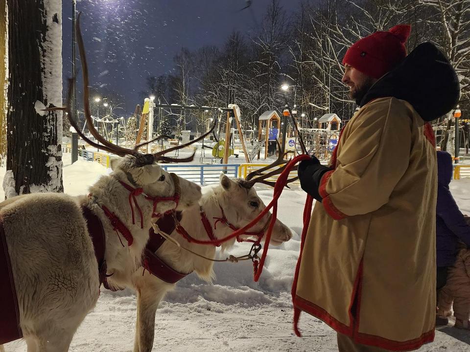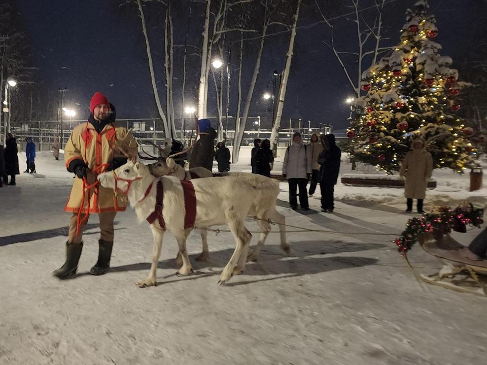 Кульминацией вечера стало катание на санях, запряженных настоящими северными оленями. Десятилетние Яша и Гек, доставленные из Мурманска под присмотром сопровождающего их Виталия, катали всех желающих.