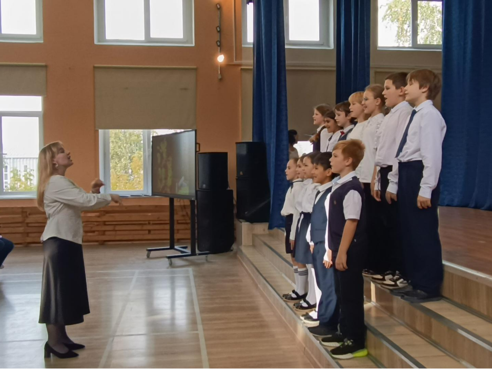 На празднике один из номеров представили четвероклассники. Под руководством учителя музыки Валерии Баловневой они исполнили песню в подарок учителям.