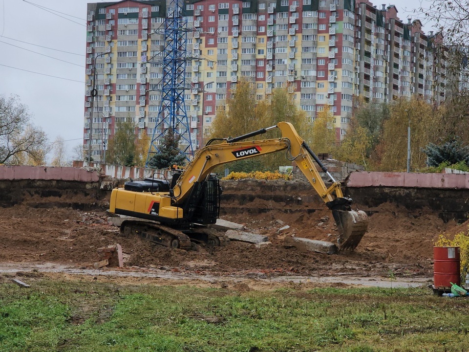 Сейчас памятник огорожен, строители используют в работах экскаватор. Они готовятся к снятию бетонных плит и другим восстановительным работам.