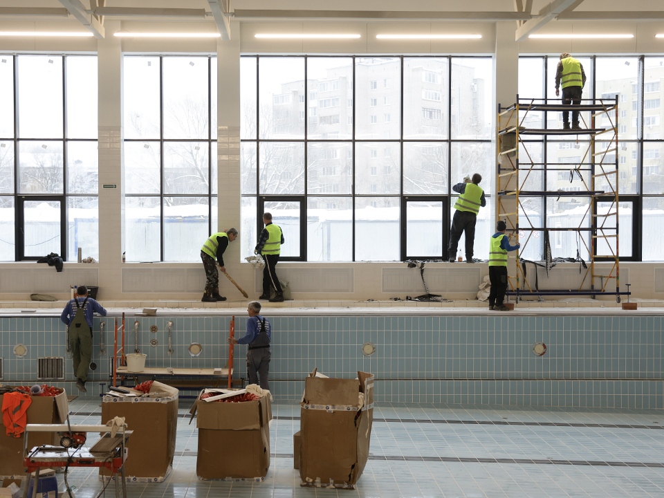 Готовность спортивного комплекса составляет 93%. Строители заканчивают монтаж системы водоподготовки, выполняют облицовку чаш, работают над фасадом и наружными сетями. На объекте трудятся порядка 60 человек.