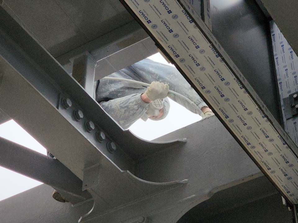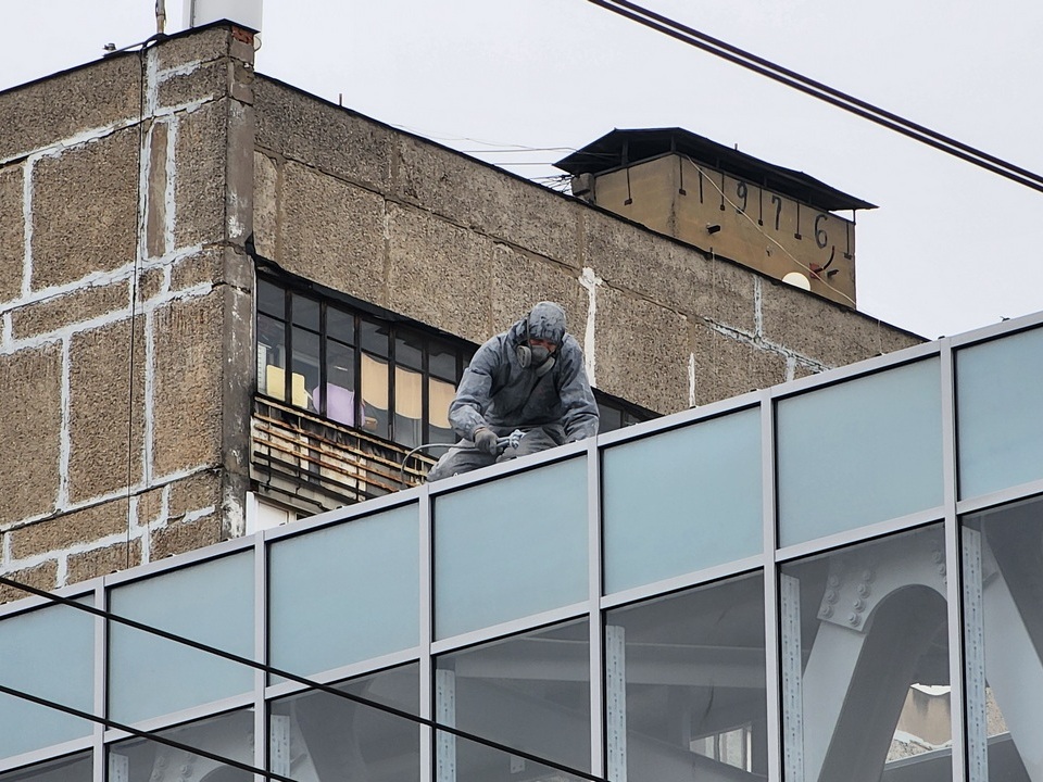 Другой подрядчик выполняет окраску металлических элементов строения.