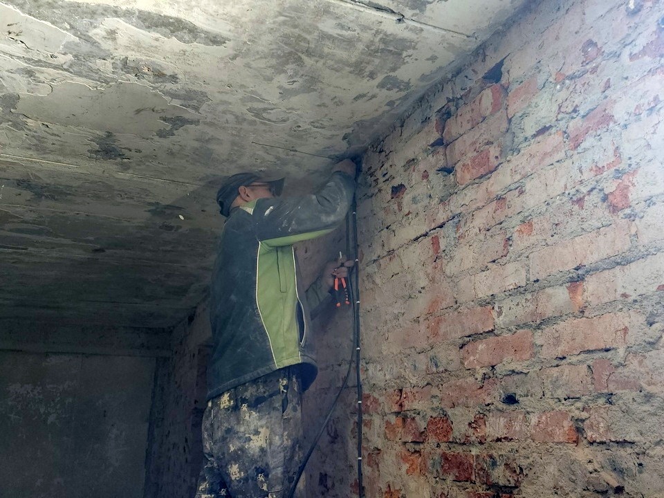Вместе с тем, энергетики прокладывают электропроводку. На других этажах планируется поставить легкие перегородки с шумоизоляцией для гостиничных номеров.