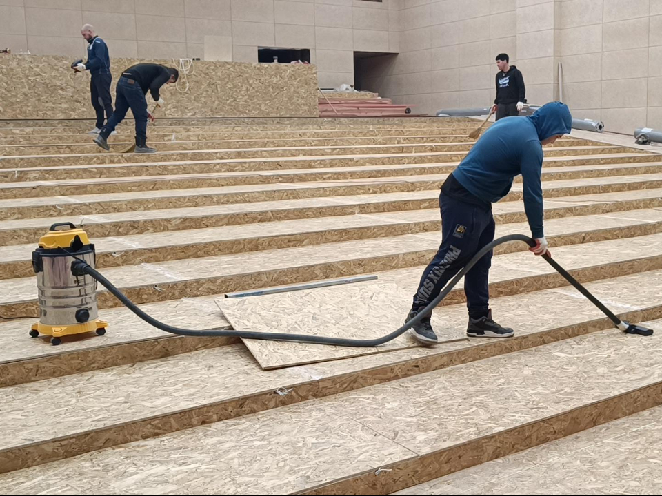 Ремонтные работы ведутся сразу на нескольких участках. Специалисты уже установили ограждение для диджейской зоны и почти завершили обшивку стен акустическими панелями. Собраны ступени перед центральной частью сцены, куда скоро уложат новое покрытие. В это же время стены за сценой окрашивают в матовый черный цвет.