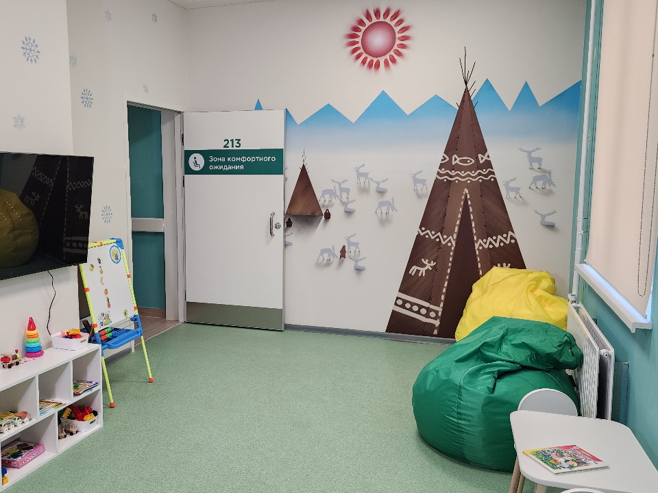 Особую атмосферу создали благодаря оформлению стен — здесь нарисовали героев мультфильма «Умка».