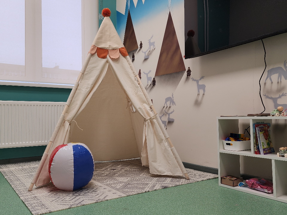 «Здесь есть предметы для развития мелкой моторики, вигвам, куда любят прятаться маленькие детки, пуфы и диваны, телевизор. Кроме того, в каждой комнате есть творческие уголки с раскрасками и карандашами», — добавила Савосько.