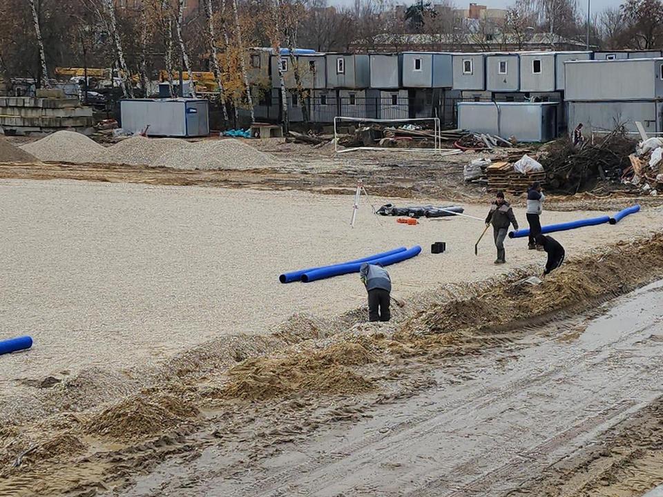 Работы на футбольном поле тоже идут полным ходом. Отсыпка здесь выполнена на 90%. По периметру поля рабочие прокладывают дренажные трубы, чтобы вода не скапливалась на его поверхности. Параллельно идет устройство пешеходных дорожек, рабочие укладывают бордюры.