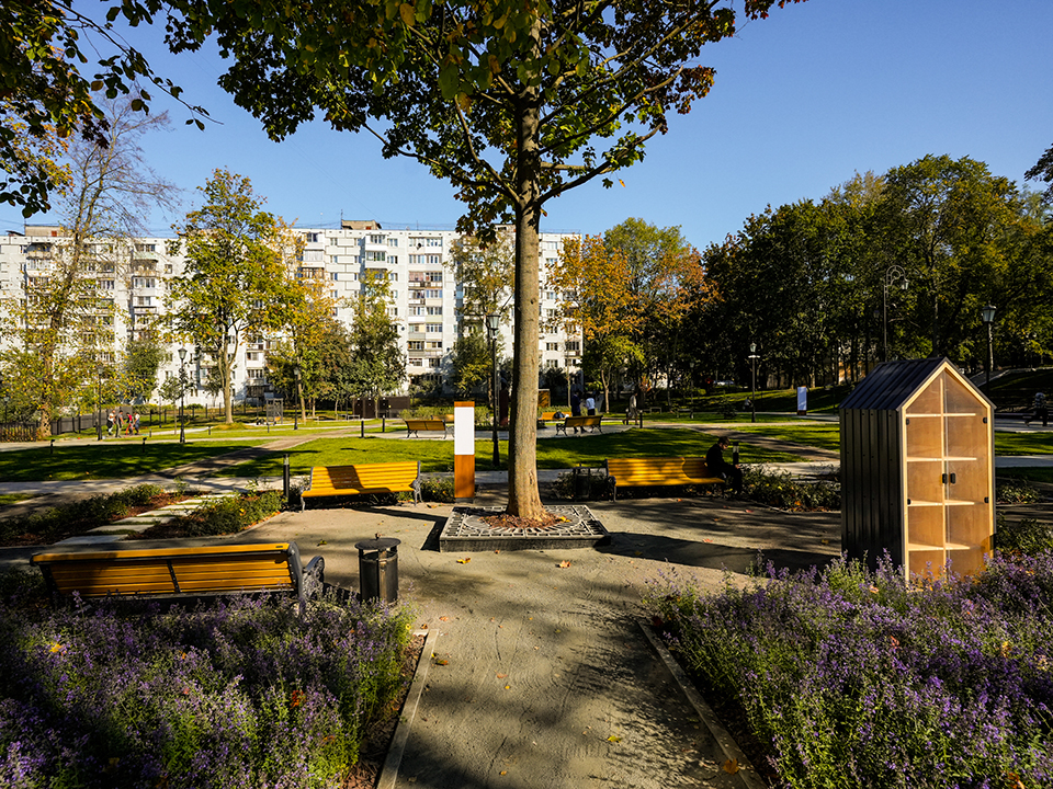 Площадь парка составляет 1,1 га. Здесь появились новые пешеходные дорожки, зоны отдыха, детская площадка, амфитеатр и беседки с качелями.