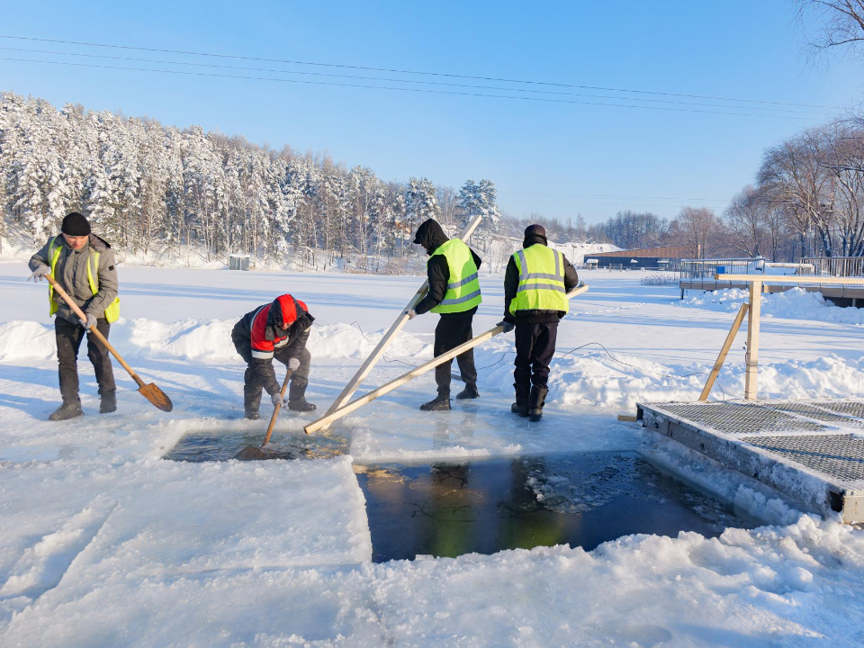 На лыткаринском карьере «Волкуша» накануне Крещенского сочельника все подготовили к омовениям верующих. Рабочие расчистили территорию и подъездные пути к купели от снега, после чего вырезали во льду крест, установили ограждение для безопасных купаний.