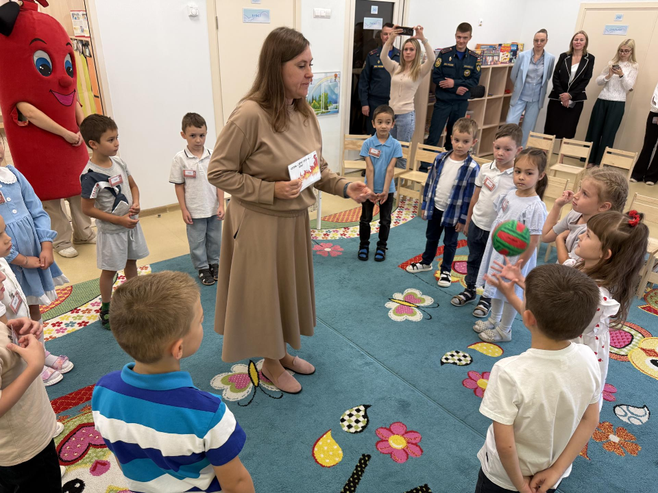 В старшей группе №7 детского сада «Созвездие» состоялось занятие по пожарной безопасности. Вместе с воспитателем его провели сотрудники МЧС и их помощник — ростовая кукла Огнетушитель. Как отмечают организаторы, такие занятия направлены на формирование у детей осознанного и ответственного отношения к правилам пожарной безопасности.