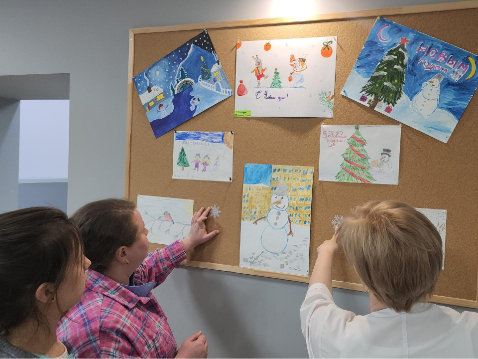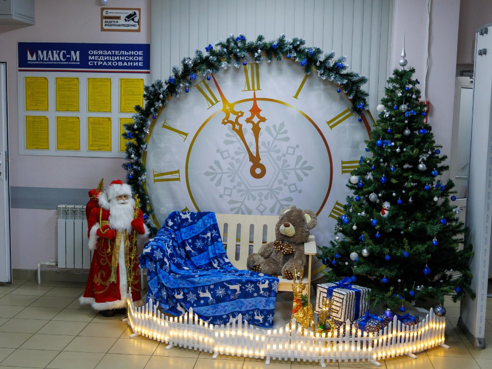 Во многих медучреждениях создали целые новогодние инсталляции. В поликлинике №6, помимо наряженных елочек, установили веселые фигуры новогодних персонажей, в Центральной поликлинике медицинские работники традиционно собрали стенд с зимними рисунками детей, в детской поликлинике №2 создали лесной уголок.