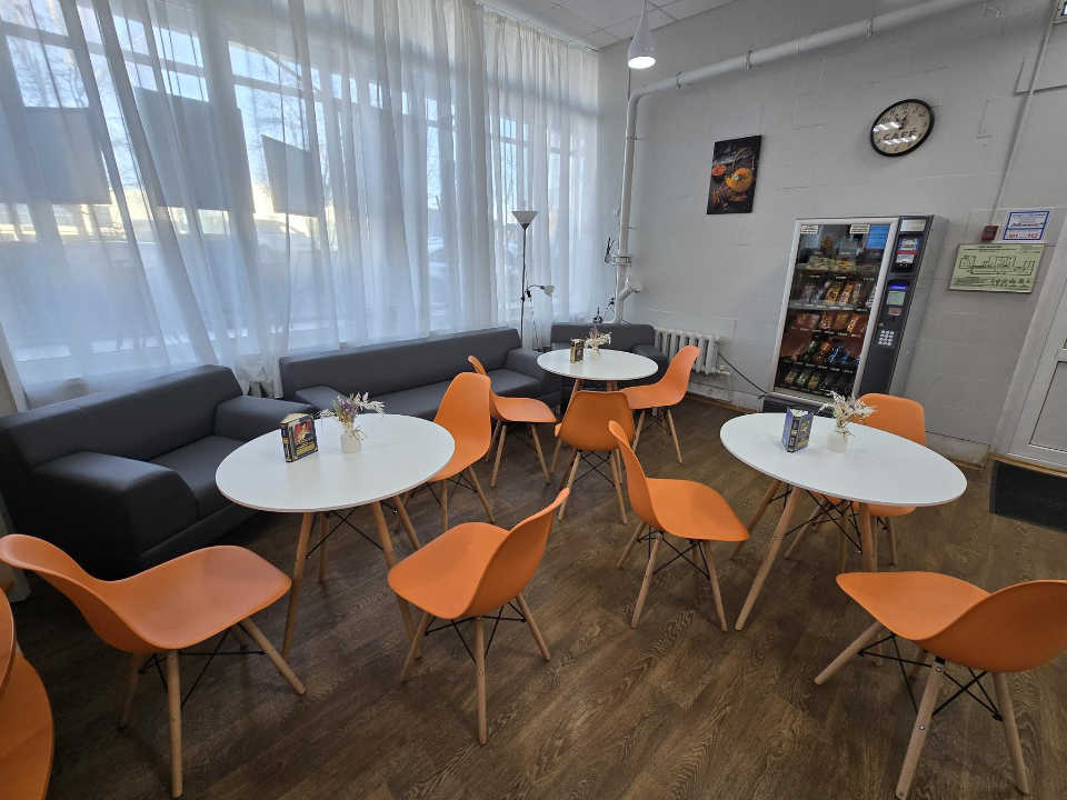 Пространство оборудовано современной мебелью, удобными диванами и креслами, стильными светильниками и автоматической кофемашиной. Вскоре планируется установка стойки самообслуживания, где посетители смогут приобрести напитки и сладости.