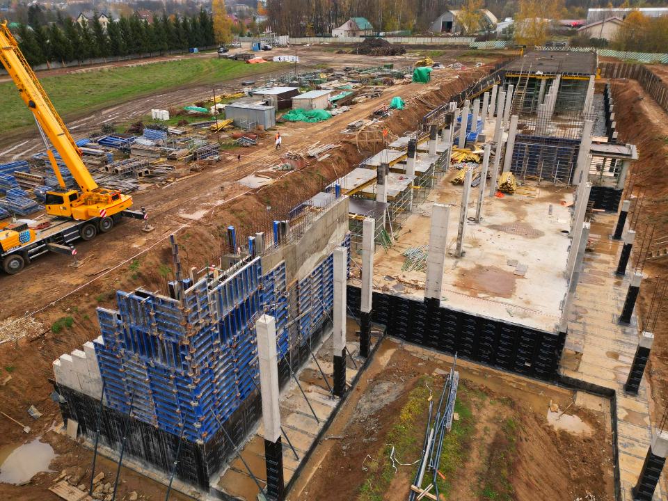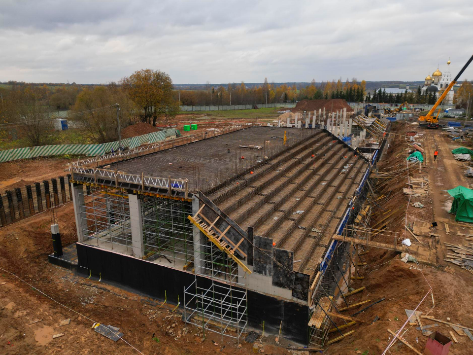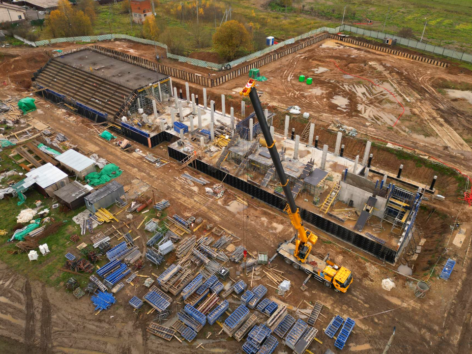 Строители занимаются возведением трибунной конструкции на 1562 посадочных места на стадионе «Спартак» в Можайске. Гидроизоляция цокольного уровня выполнена, заканчивается установка теплоизоляционных материалов и водоотталкивающей мембраны. На участке будущего ограждения укреплены плита перекрытия и опорная стена из свай, готовящиеся к заливке бетона.