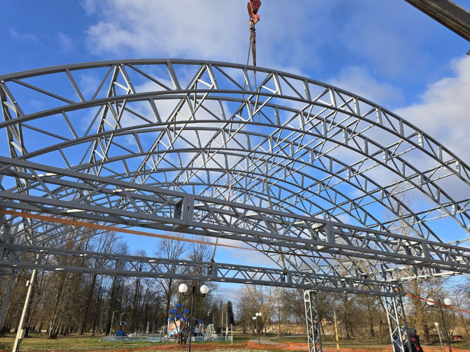 В нижней зоне парка «Ривьера» начались работы по возведению современной профессиональной сцены. Строительная бригада завершила подготовку участка и приступила к монтажу металлического каркаса будущей конструкции.