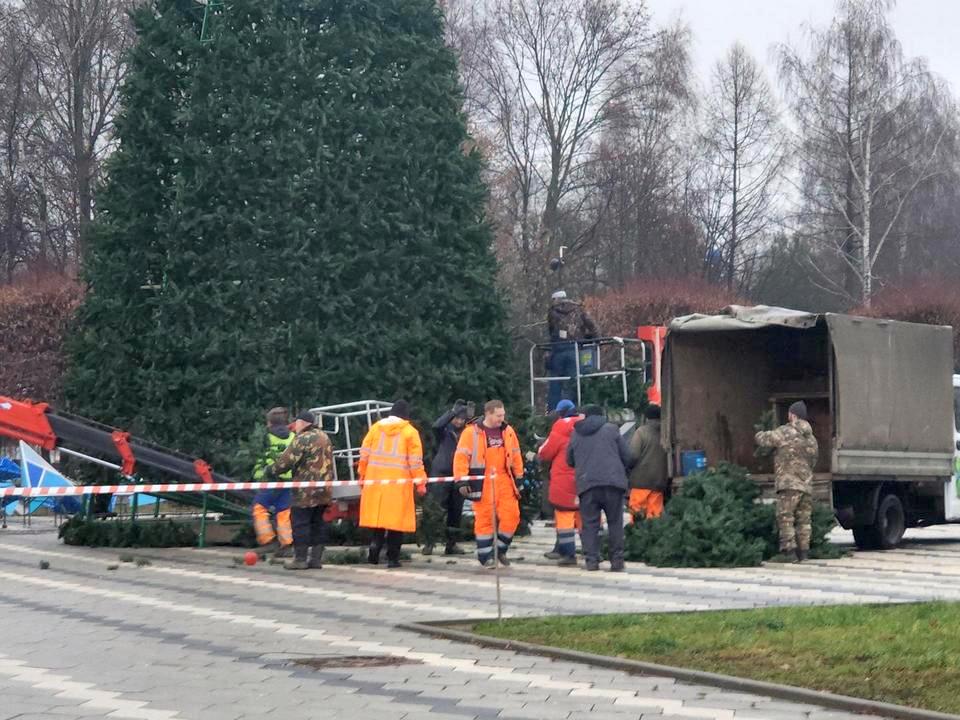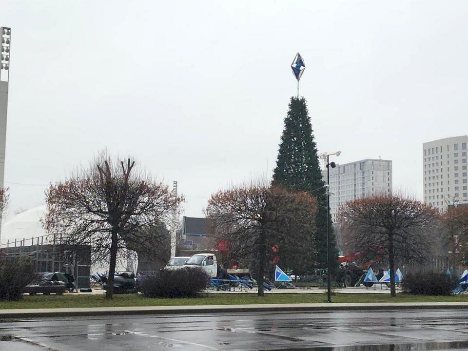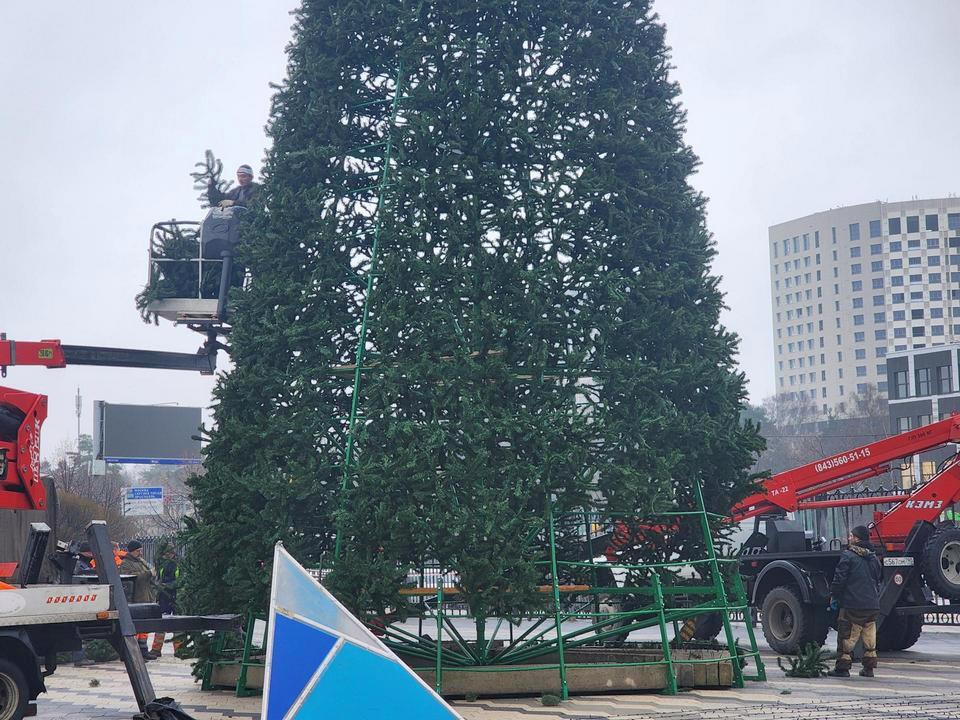 На площадке трудятся более десяти специалистов, они тщательно и кропотливо разбирают ветви и размещают их на металлическом каркасе. Чтобы полностью заполнить его рабочих поднимают на высоту с помощью двух автокранов. На вершине ели уже установили нарядный шпиль. Как и в прошлом году, ель будет украшена в сине-голубой гамме, на ней будет несколько десятков «ледяных» осколков — световых панно.
