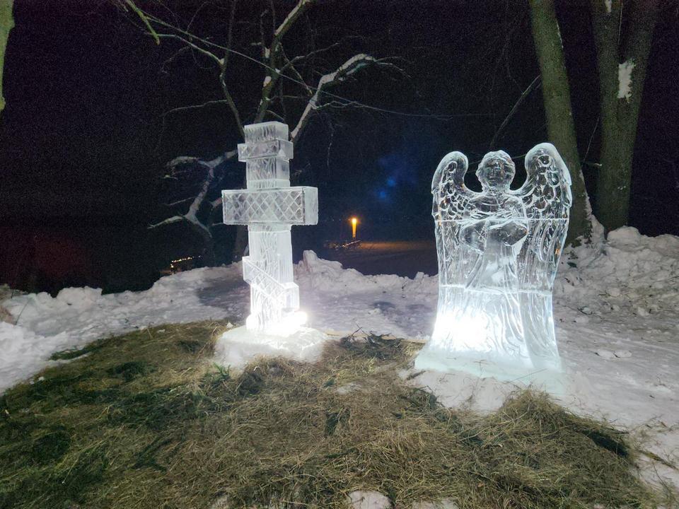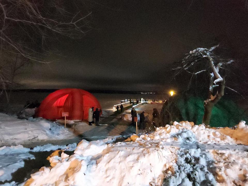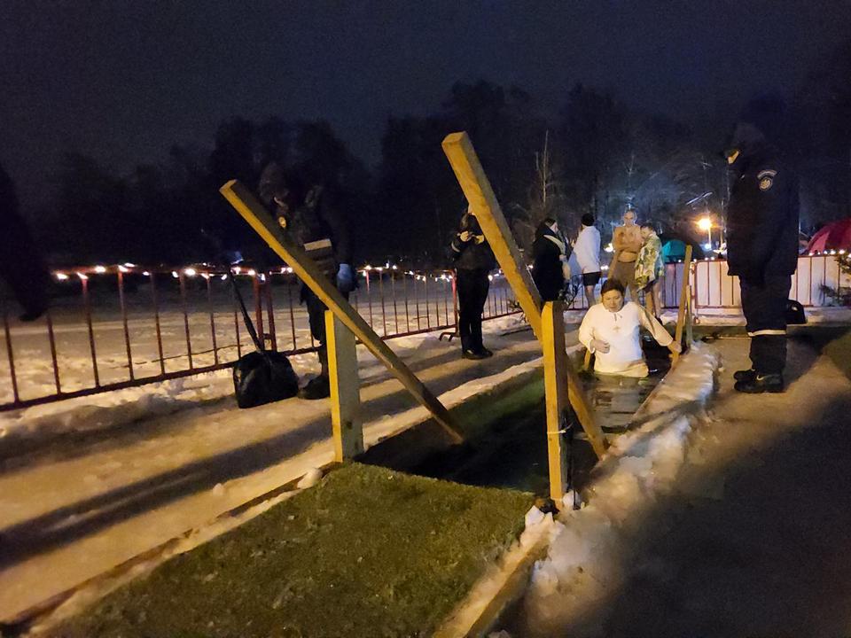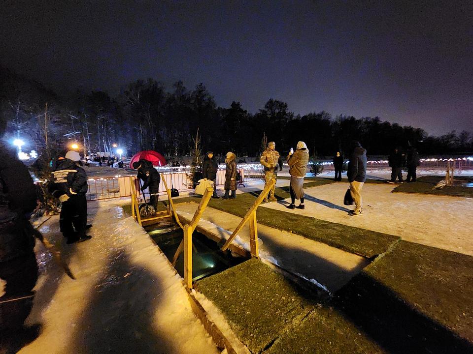 Специалисты заранее тщательно проверили состояние льда: его толщина, достигающая 15-20 см, позволила безопасно организовать купания. Внутри смонтировали деревянные ступени и перила, провели освещение. На льду проложили настилы, по которым можно было безопасно пройти к проруби.