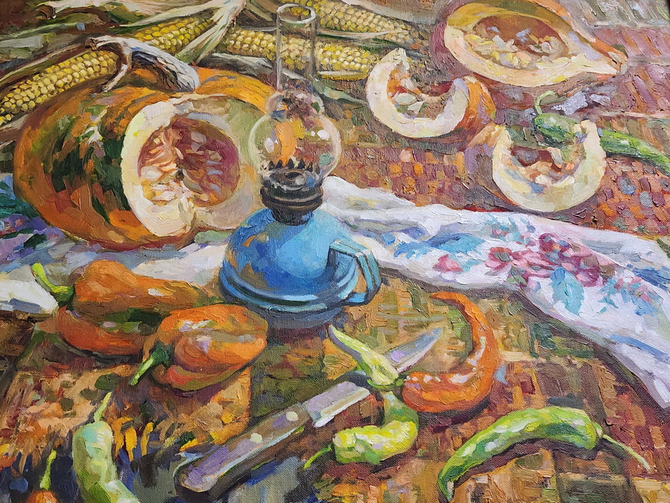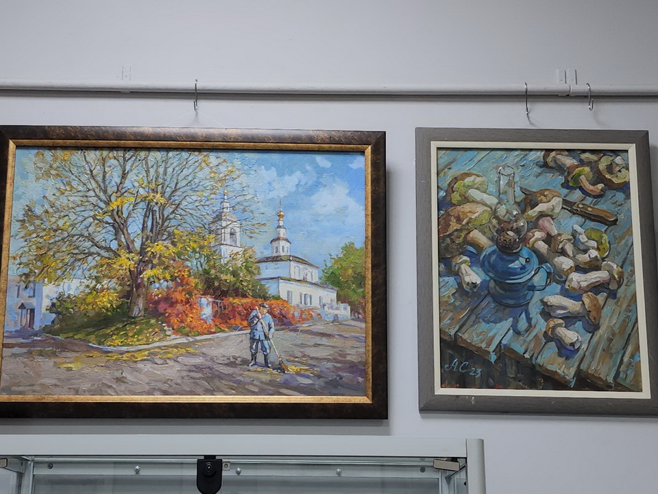 Вторую половину экспозиции занимают работы самого преподавателя Алексея Саблина. Его творчество отличается особым вниманием к деталям природы и эмоциональностью образов. Тематически объединенные темой осени, представленные картины наполнены теплыми красками и атмосферой русской провинции.