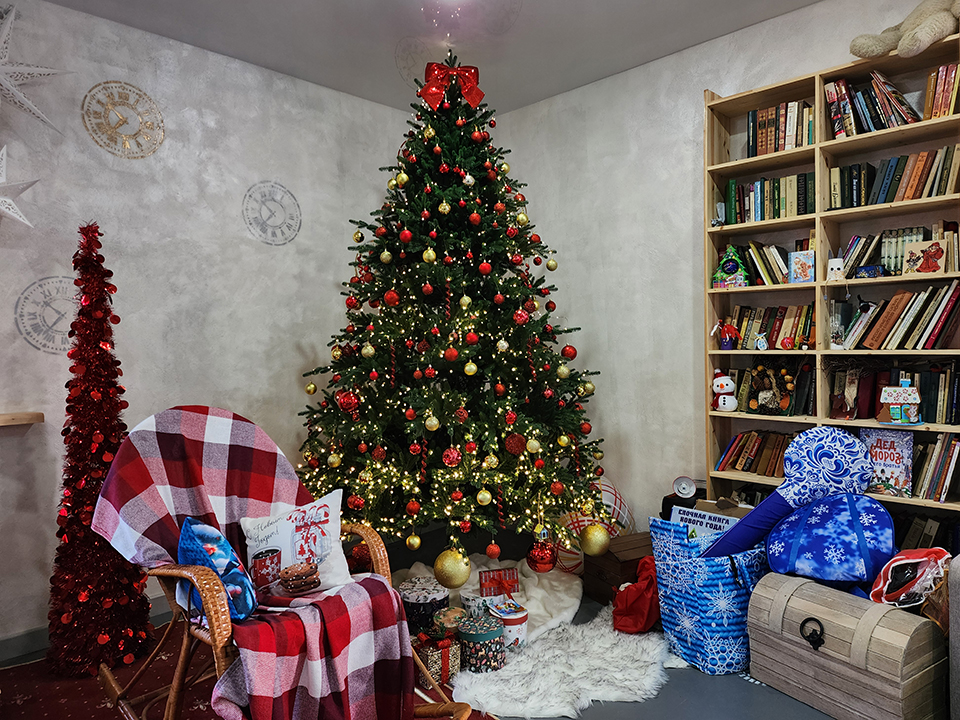 Внутри терема оборудован фотозал с красивыми декорациями: каждый сможет сделать памятные фотографии у украшенной елки, на троне Деда Мороза и возле уютного камина. Для маленьких гостей приготовлена большая зеленая елка на улице, около которой можно загадать желание.