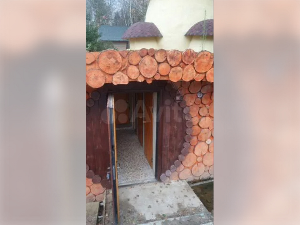 Судя по фотоснимкам, приложенным к объявлению, здание выполнено из бревен по индивидуальному проекту в форме гигантского гриба-боровика. В нем есть санузел, отопление и водоснабжение из скважины.