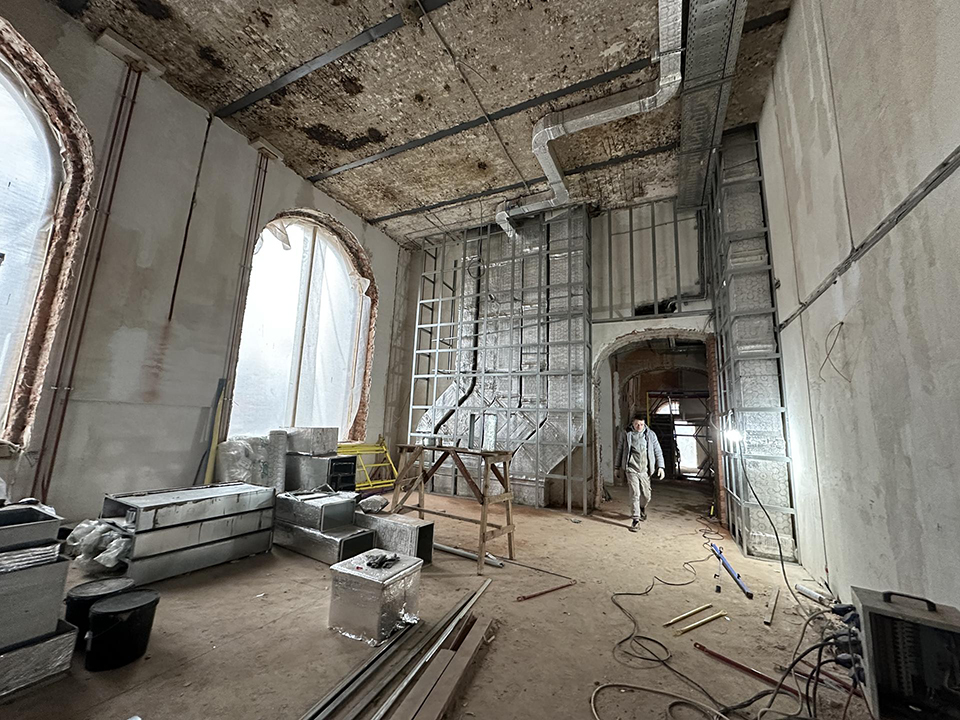 Строители монтируют инженерные системы, проводят новую электрику, сантехнику, вентиляцию, системы связи и пожарный водопровод. Параллельно готовят помещения для укладки керамогранитной плитки и сооружают ограждения на лестницах.