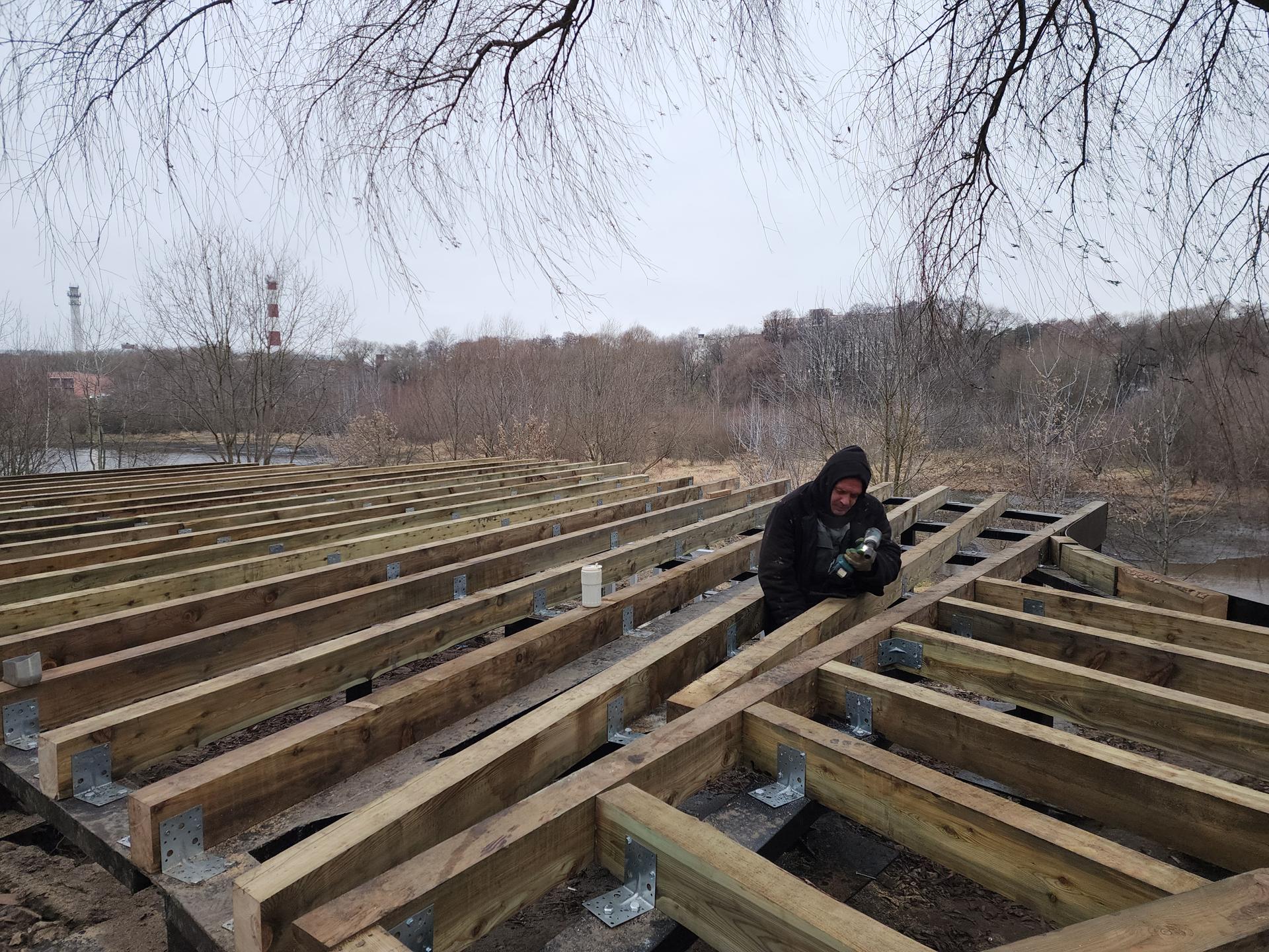 Сейчас специалисты генподрядной организации обустраивают площадку для принятия солнечных ванн. Рабочие монтируют металлический каркас, на который в дальнейшем уложат деревянный настил.