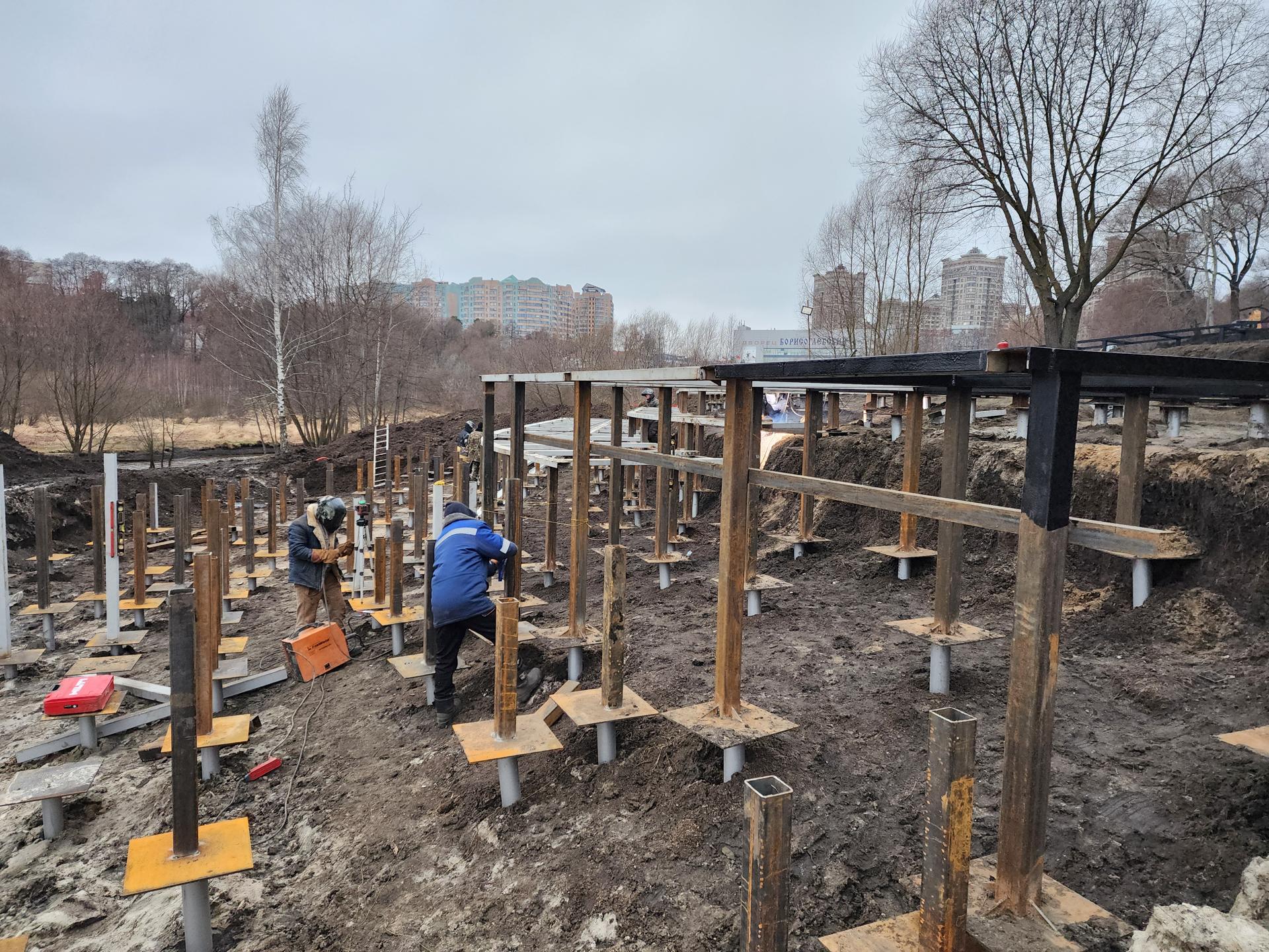 Перед монтажом площадки строители провели подготовку: расчистили территорию, проложили коммуникации для освещения и подготовили основание для будущих дорожек. Все это создает базу для дальнейших работ.