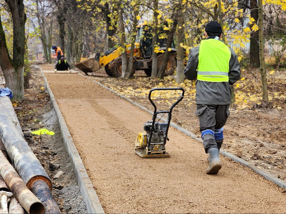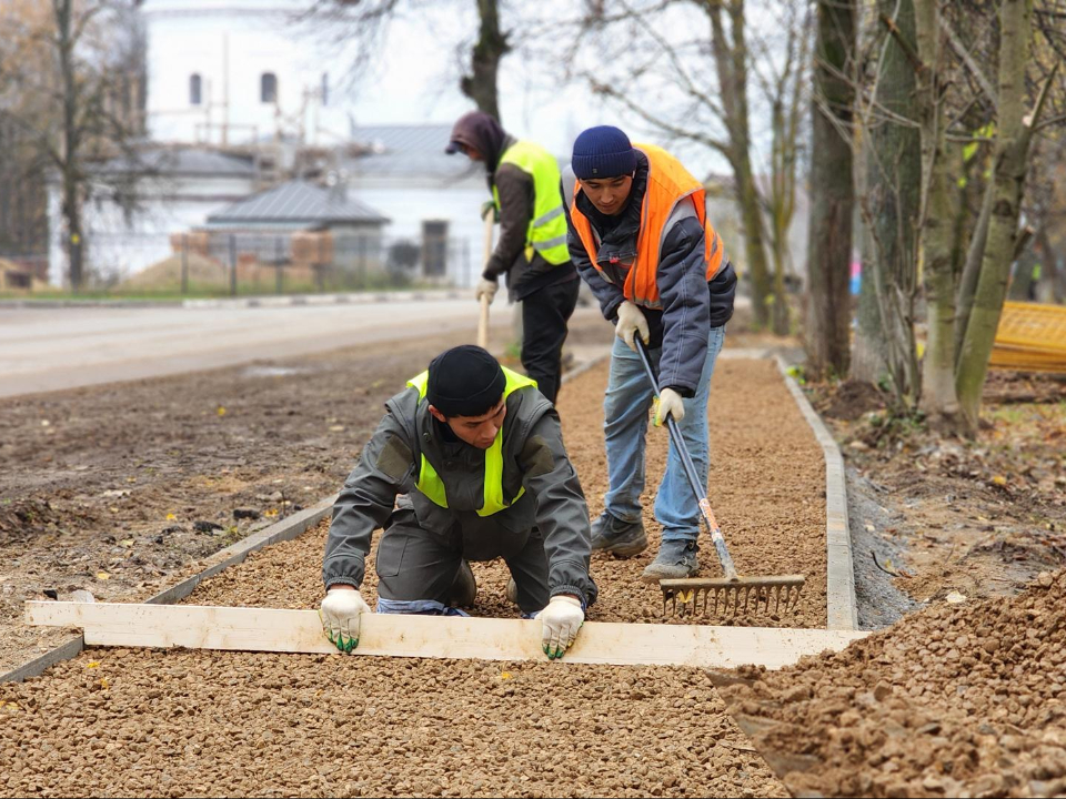 Здесь ранее установили бортовой камень, а также сформировали песчано-гравийную «подушку», которая станет основой пешеходной дорожки.