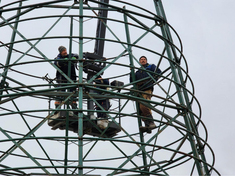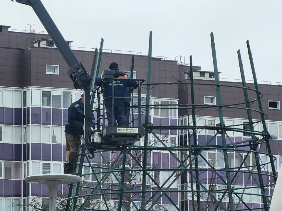 Устанавливают металлический каркас «дерева». В скором времени на него «наденут» пушистые ветки и сверкающие праздничные огни.