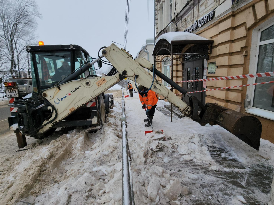 Специалисты работают вручную — лопатами и ломами, а для уборки больших объемов используют трактор. Дорожники работают с ювелирной точностью, чтобы не повредить плитку и лестницы, ведущие в магазины и соцучреждения.
