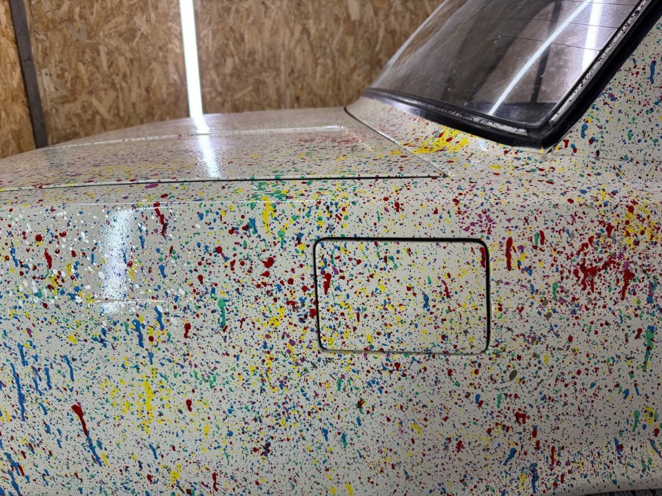 Кстати, это далеко не первая такая яркая работа автомаляров студии. Буквально летом этого здесь же белая вазовская «пятерка» получила окрас «цветных брызг», как после шоу красок, а на «ИЖ» каллиграфию и вовсе нанесли вручную кистью.