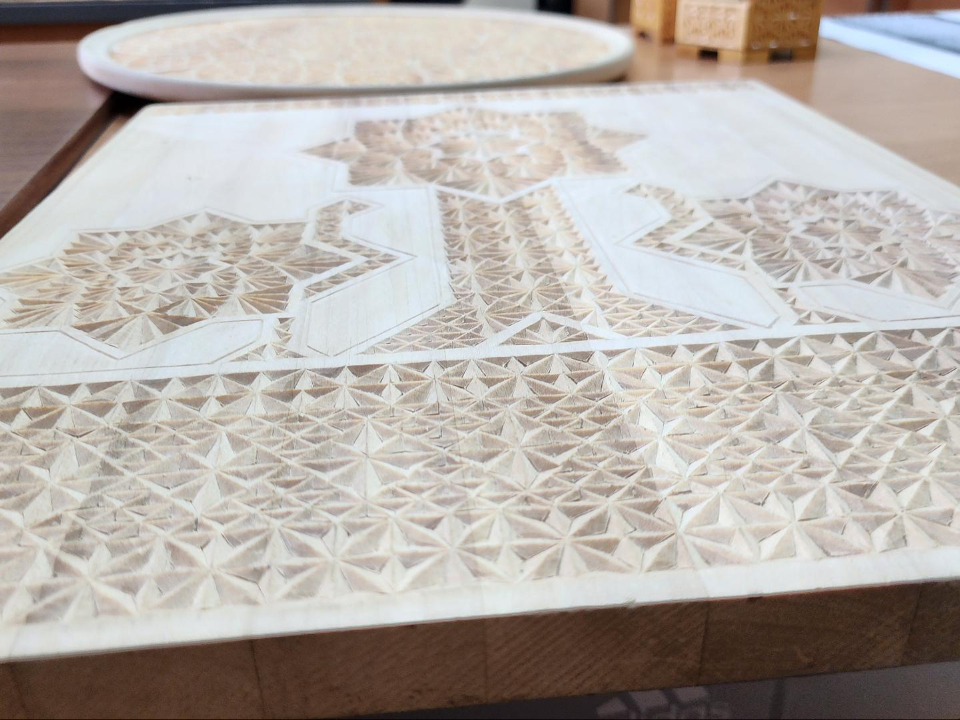 Ольга Пискунова обладает навыками контурной, скобчатой, геометрической, абрамцево-кудринской, рельефной резьбы и владеет резьбой «Татьянка». Понравившиеся изученные образы стилизуют в геометрической резьбе.