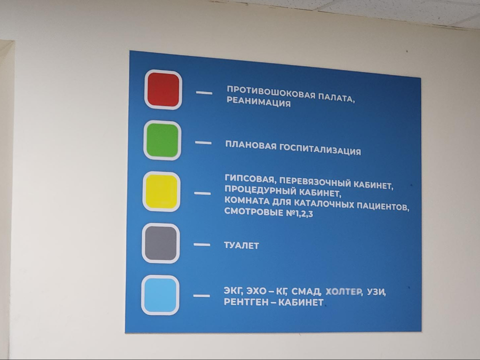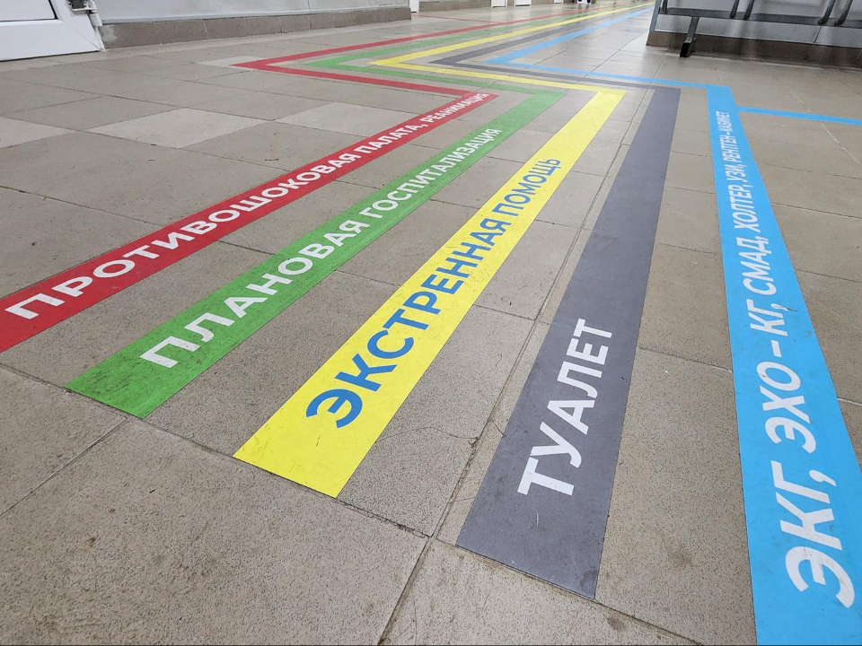 По всему первому этажу медучреждения на пол нанесли цветные полосы. Каждая из них ведет в определенный кабинет. Там же на стене — расшифровка цветов и для удобства — дополнительные информационные таблички под потолком.