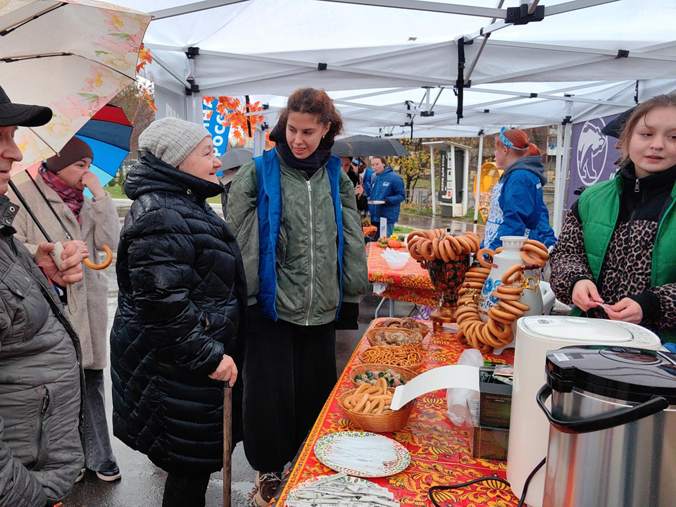 Кроме того, волонтеры обустроили уютную чайную зону, где приветливо встречали гостей в нарядных платках и кокошниках. Посетители могли выпить чашечку горячего чая с баранками, сладкими конфетами и пряниками, а также попробовать гречку с тушенкой, ароматный плов и домашние соленья. Сами жители отмечали, что подобное мероприятие олицетворяет тепло, радушие и неизменное единство многонационального народа России.