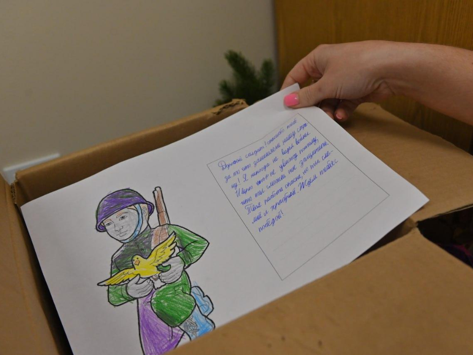 К возможности поздравить бойцов присоединились и дети, раскрасившие новогодние открытки с поздравлениями солдатам. Некоторые уже оставили готовые поделки на пунктах сбора.