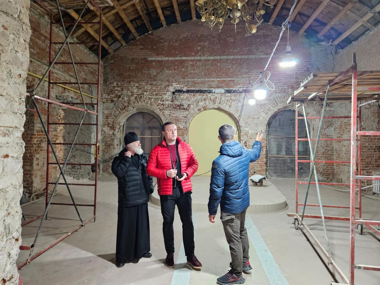 Внутри храма рабочие убрали старую штукатурку и потолки, а также начали восстанавливать полы. Открыли ранее заложенные окна. От исторического наследия внутри храма почти ничего не осталось, кроме небольшого фрагмента потолка, который будут восстанавливать по оригиналу. Однако специалисты-реставраторы обнаружили интересные элементы кладки, с которыми сейчас работают.