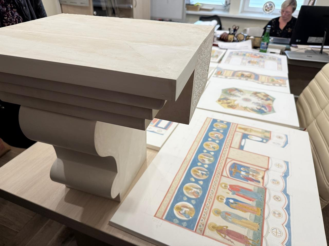 По словам Пахомова, храм должен стать легким и светлым. Внутри уже появляются наброски росписи стен и формы колонн и подоконников.