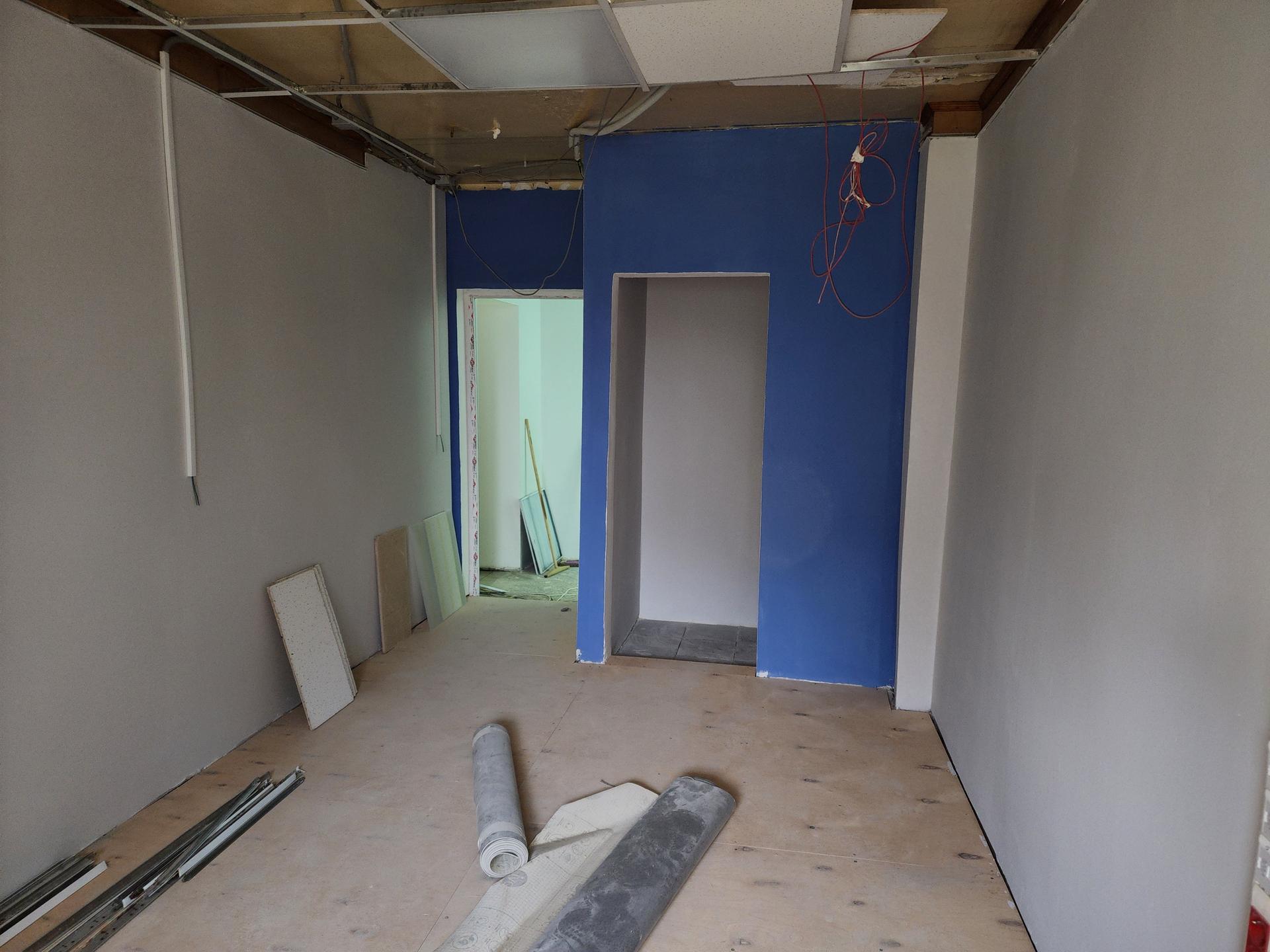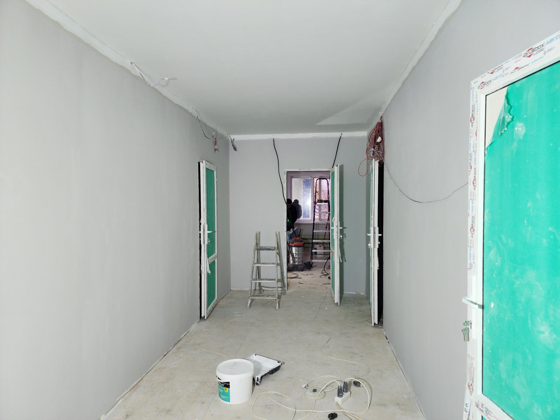 Специалисты уже установили пластиковые двери, частично выложили напольную плитку, провели во всех помещениях электромонтажные работы, заменили потолочное покрытие на новое из негорючих материалов и оснастили потолок датчиками, готовят к покраске в светлые тона стены.