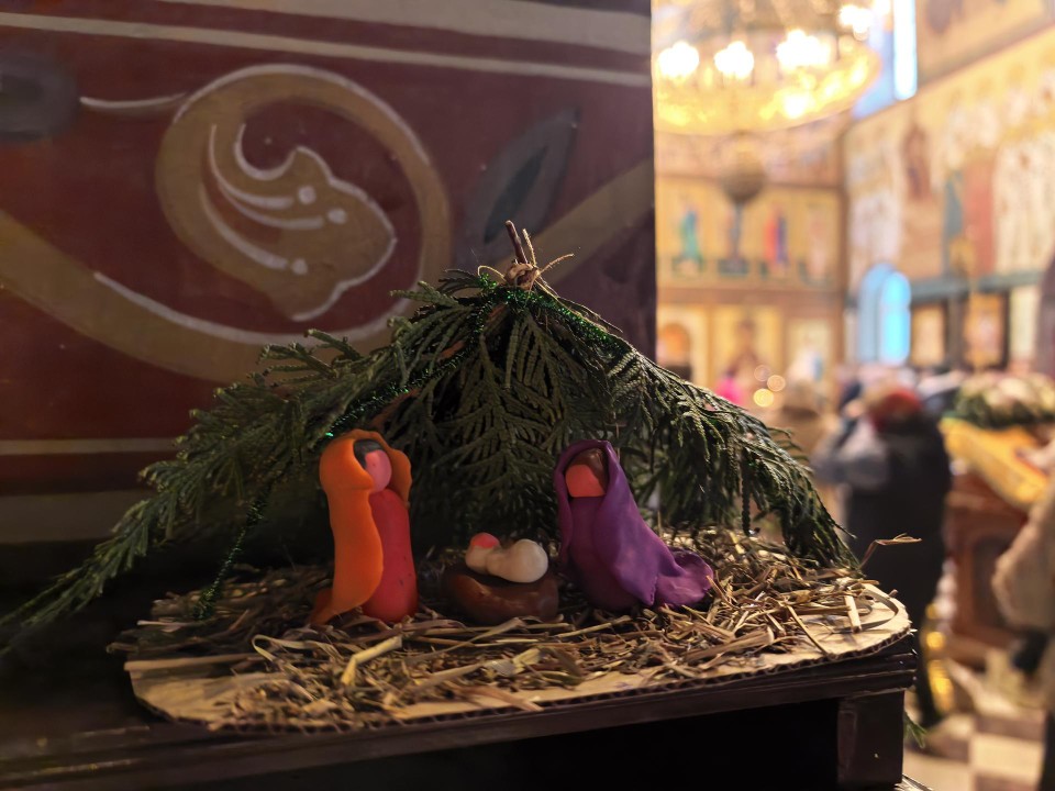 На занятии дети под руководством педагога Юлии Соловьевой лепили из пластилина фигурки Младенца, Девы Марии и Иосифа. Для украшения использовали натуральные материалы: сено и ветки туи.
