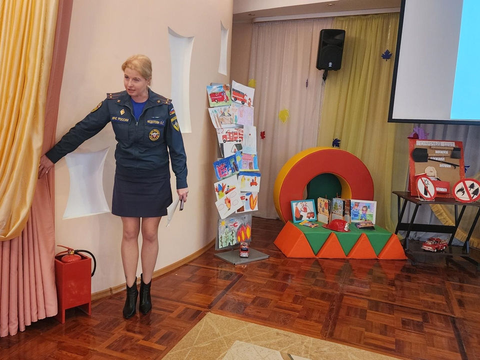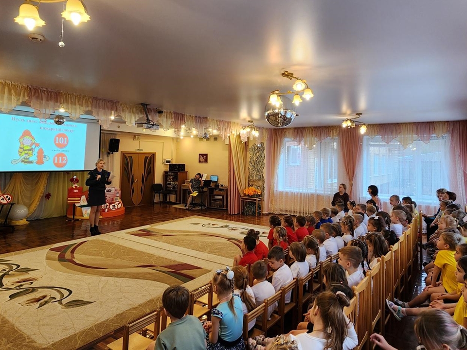 В музыкальном зале малышей ждали яркие наглядные пособия: картинки с огнетушителями, настоящая каска пожарного и даже ростовая кукла в образе огнетушителя. Почти 60 воспитанников средних, старших и подготовительных групп с интересом внимали гостье.