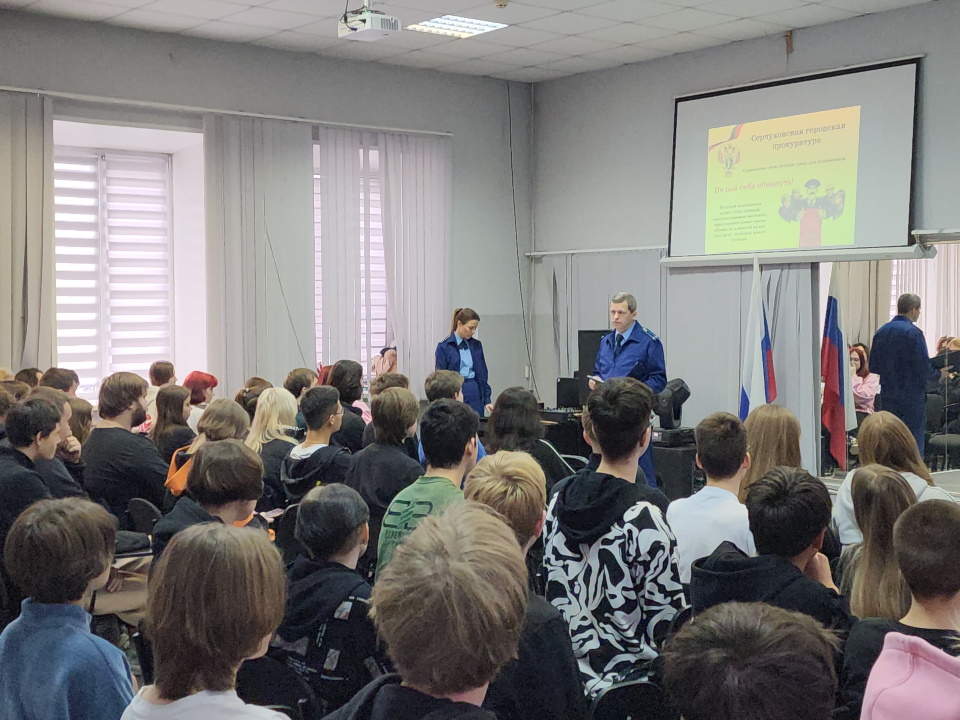 Студентам Серпуховского открытого колледжа рассказали о способах защиты от телефонных мошенников. Профилактическую беседу с демонстрацией учебного фильма провели заместитель городского прокурора Виктор Грушевский и помощник прокурора Анастасия Цапаева для учащихся 2-го и 3-го курсов в актовом зале колледжа.