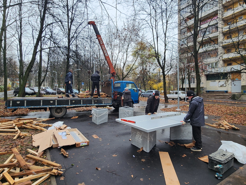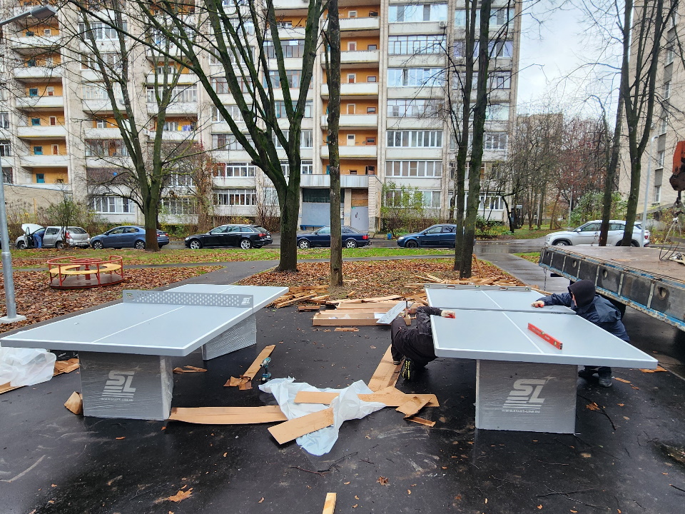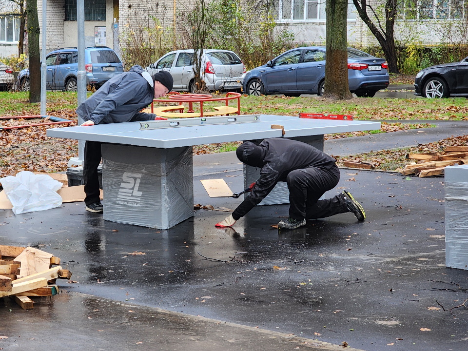 На подготовленной площадке установлены два бетонных антивандальных стола для настольного тенниса. Монтаж выполнила бригада из четырех специалистов компании из Серпухова, занимающейся производством и установкой детских и спортивных объектов. Для установки бетонных конструкций использовался спецавтомобиль с подъемником. Работа заняла примерно 2,5 часа.