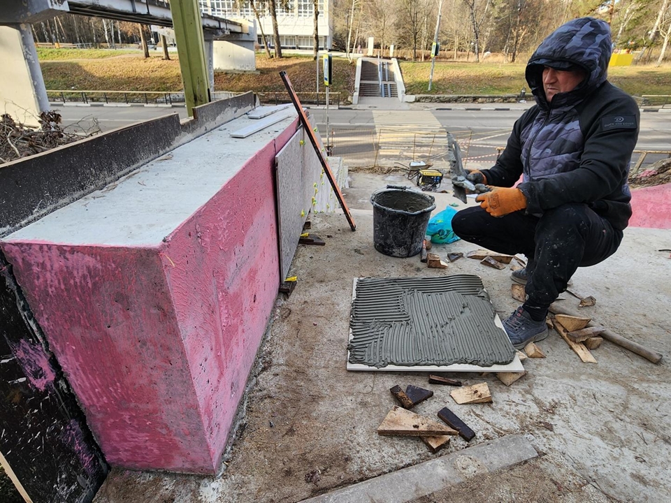 19 ноября мастера приступили к отделке: первым делом серый керамогранит с эффектными яркими вкраплениями ложится на подпорные стенки. Уже в первые два дня рабочие планируют завершить этот этап, после чего приступят к самому зрелищному, облицовке ступеней и пролетов. Весь процесс займет около недели.