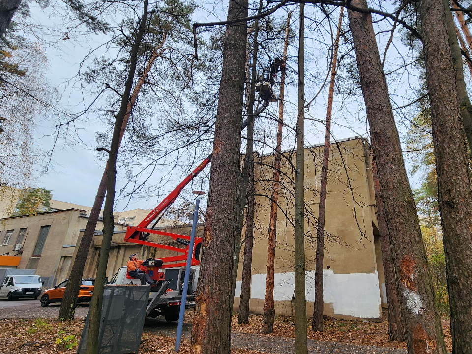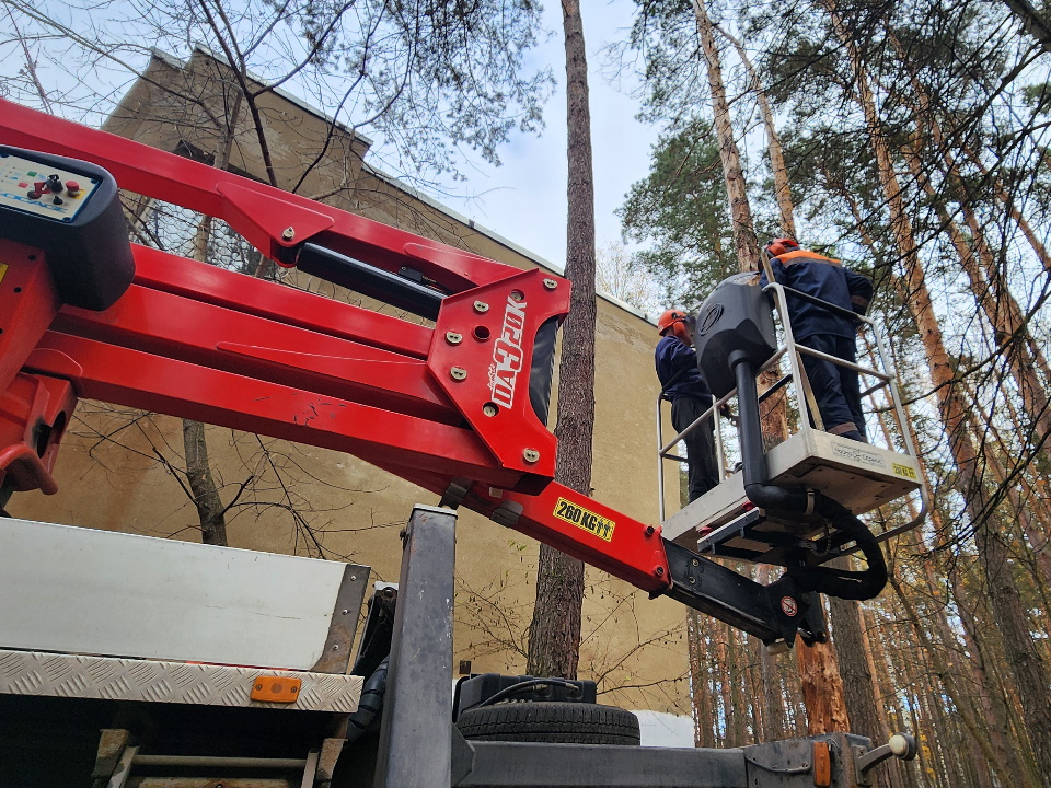 Бригада лесотехников «Комбината благоустройства» при помощи автовышки быстро и безопасно спилила аварийное дерево, затрачивая на работы менее часа. Ствол мертвого дерева распилили на небольшие бревна. Их вывозом и утилизацией в течение трех дней займется другая бригада сотрудников комбината.