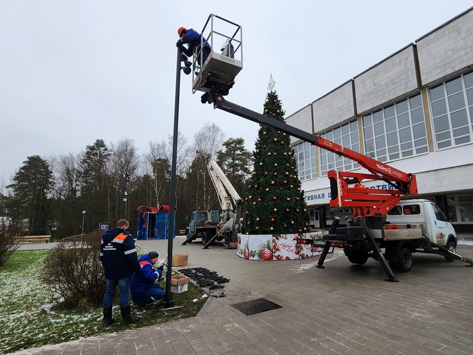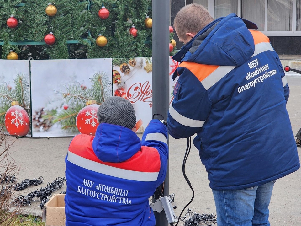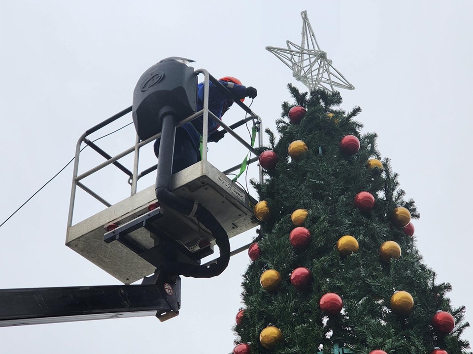 Специалисты «Комбината благоустройства» сначала собрали металлический каркас с помощью автовышки, а затем декорировали его натуральной хвоей. Сейчас дерево уже преобразилось: на ветках расположились яркие украшения — золотые и красные шары. Сегодня рабочие планируют закончить установку праздничной подсветки.