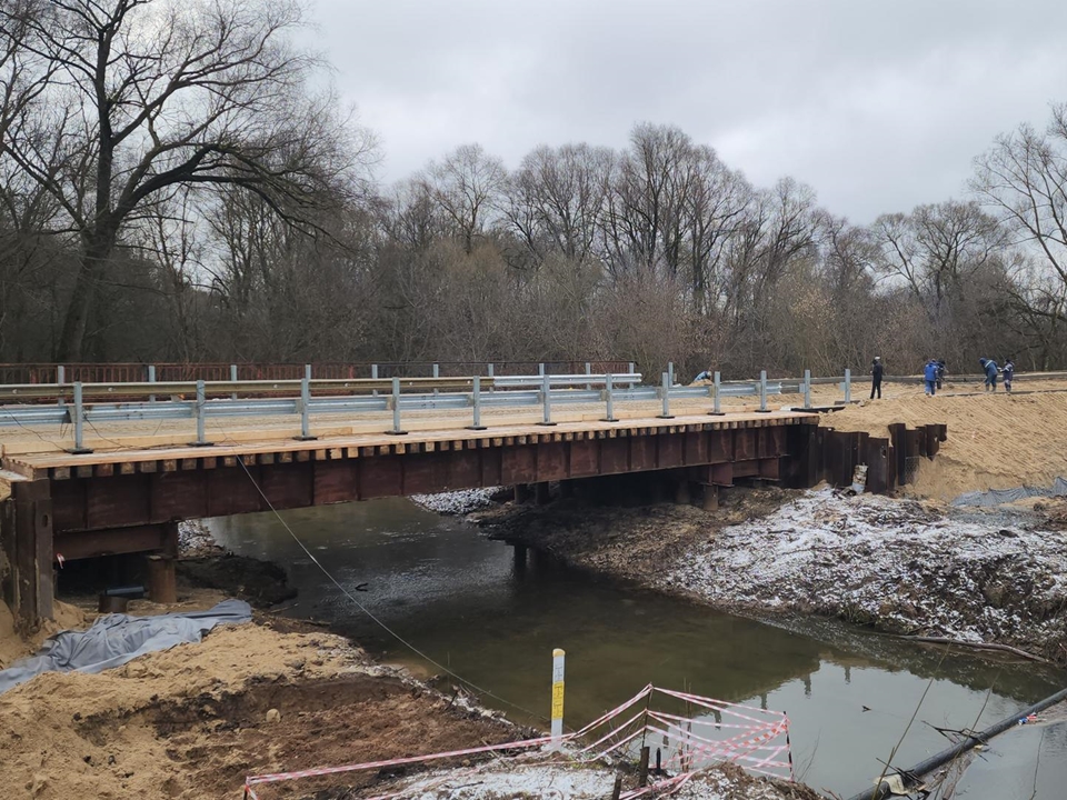 Одновременно ведется строительство временного моста. Его планируют открыть для транспорта в скором времени. Сейчас рабочие занимаются подготовкой к укладке асфальта на подъездных путях.