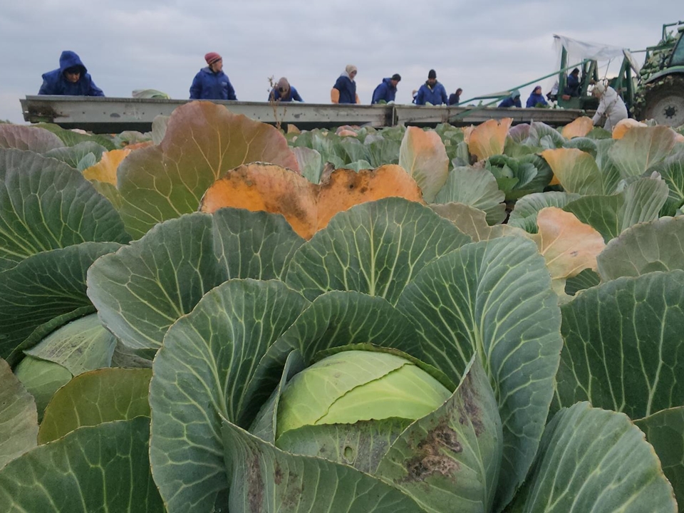 Сбор урожая осуществляется вручную: десять работников используют большие тесаки, чтобы аккуратно срезать кочаны и положить их на транспортерную ленту. Затем два сотрудника укладывают овощи в специальные контейнеры, расположенные в кузове грузового автомобиля.