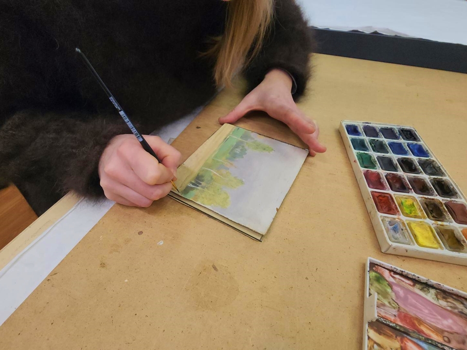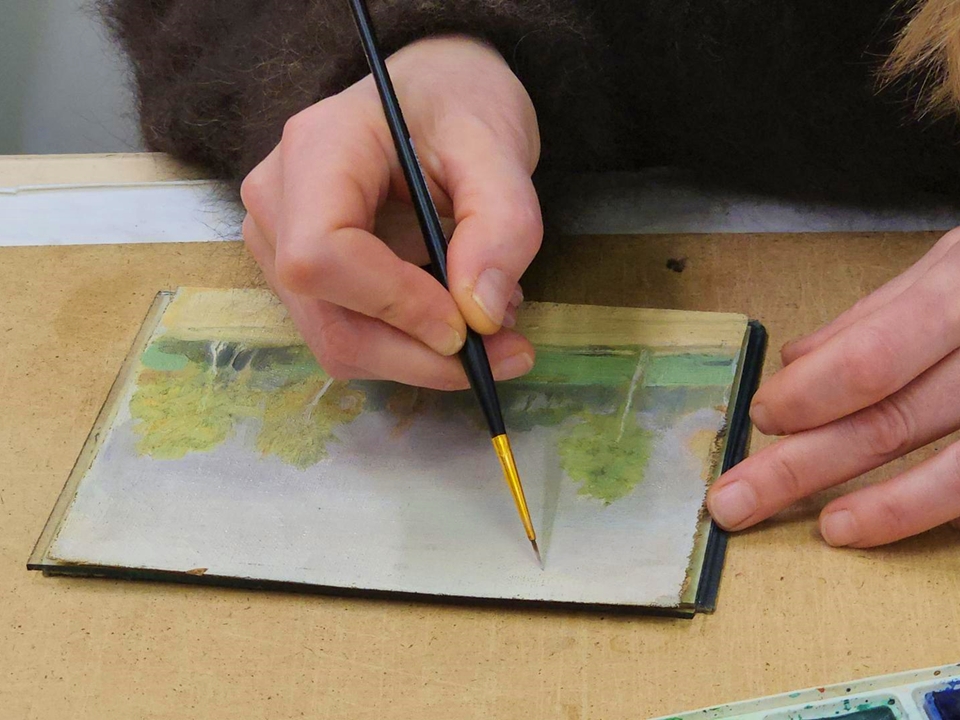 Реставратор покрывает потертости в красочном слое и грунте тонким слоем акварельных белил. Это завершающая стадия реставрации: после восполнения всех утрат и технической работы специалист ведет тоновую и цветовую сборку композиции.
