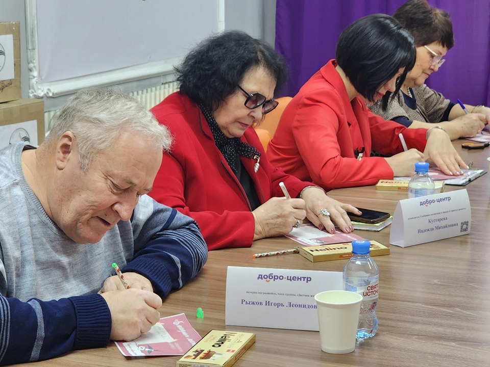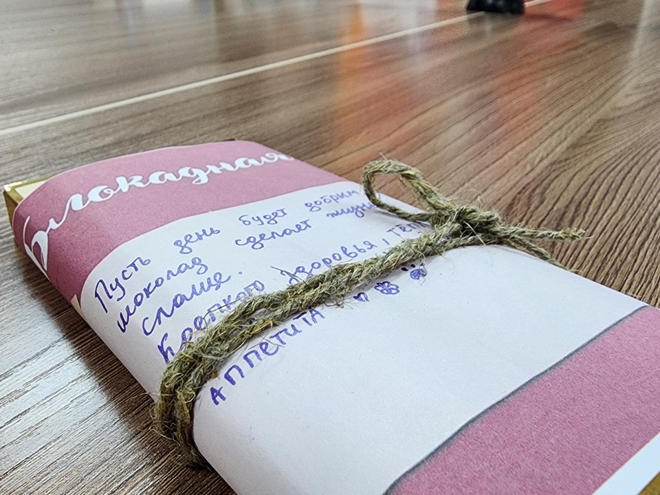 Каждый из присутствующих написал письмо со словами поддержки и прикрепил его к плитке шоколада. Эти посылки отправят российским бойцам в зону специальной военной операции.
