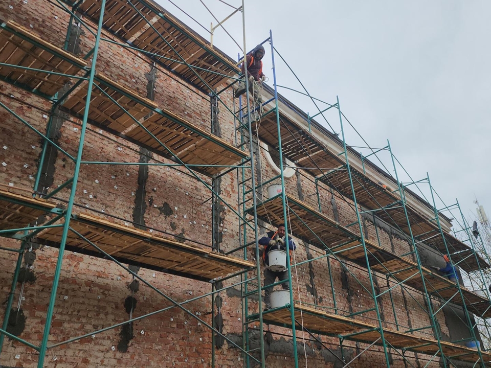 «Сейчас мы работаем с фасадом: на металлическую сетку последовательно наносим штукатурку и шпаклевку. После этого предстоит двухслойная покраска. В ближайшие два-три дня планируем завершить оштукатуривание стен с правой стороны здания. Полностью с фасадными работами рассчитываем управиться до конца ноября», — рассказывает начальник участка Сергей Килимник.