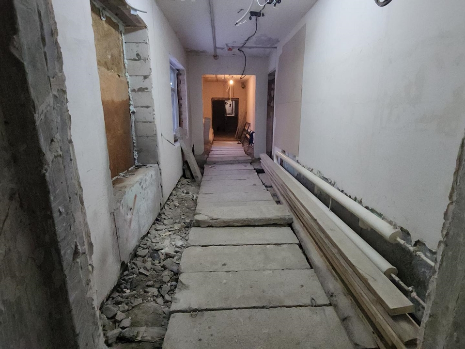 Кроме того, подрядчик завершил монтаж новых окон во всем здании. Это позволило рабочим сконцентрироваться на внутренних работах.